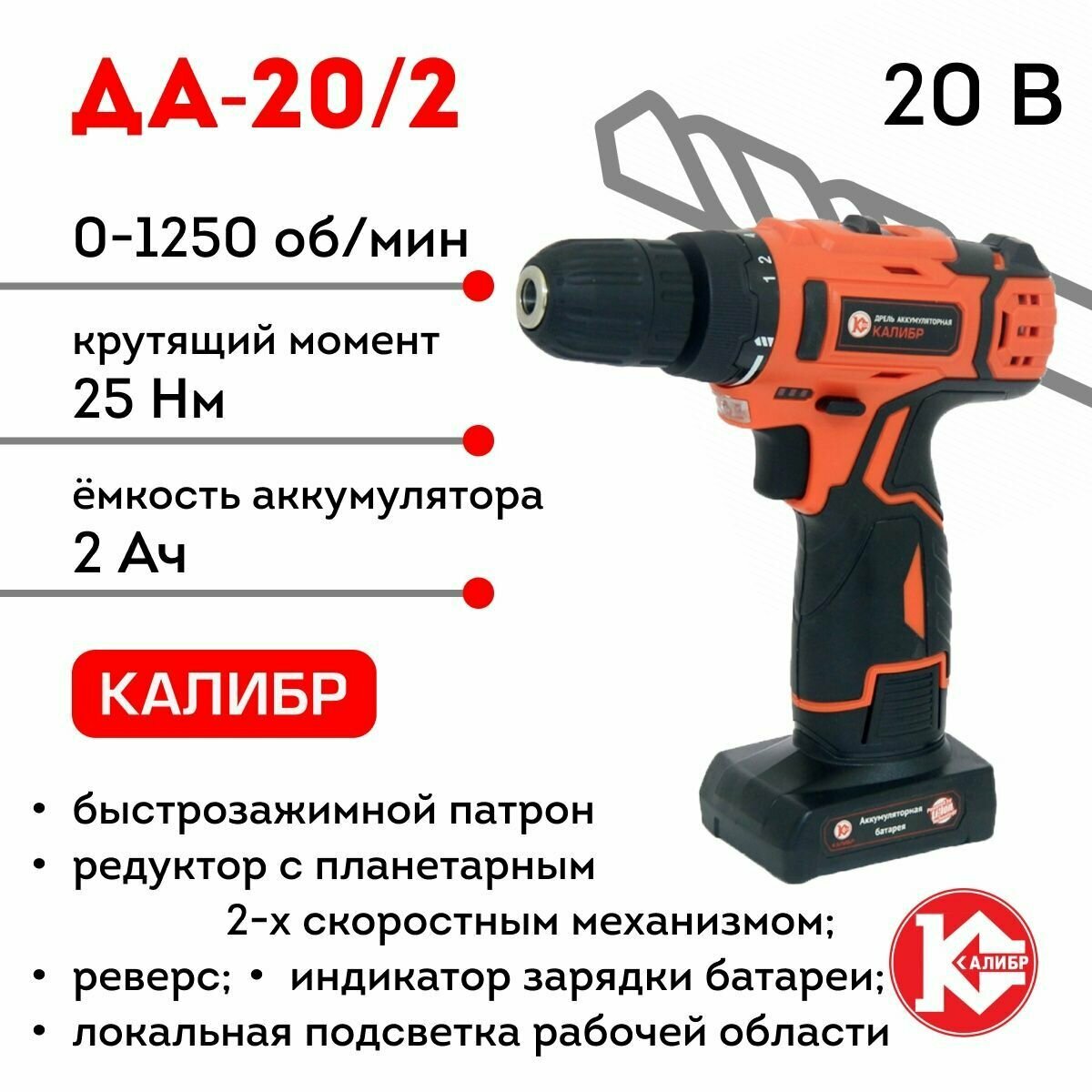 Аккумуляторная дрель (Li-Ion) Калибр ДА-20/2 Кейс информация: