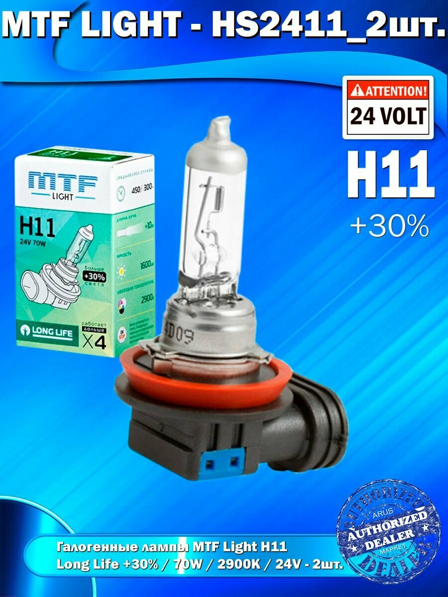 10 цен на Галогенные лампы MTF Light H11, 24V, 70W, +30% LONG LIFE x4, 2шт.