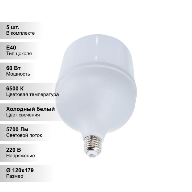 (5 шт.) Светодиодная лампочка IN HOME 60Вт 230В 6500К Е27/E40 информация: