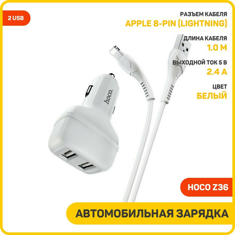 Автомобильное зарядное устройство (АЗУ) Hoco Z36 (2 USB) + кабель Lightning, 2.4 А, белый