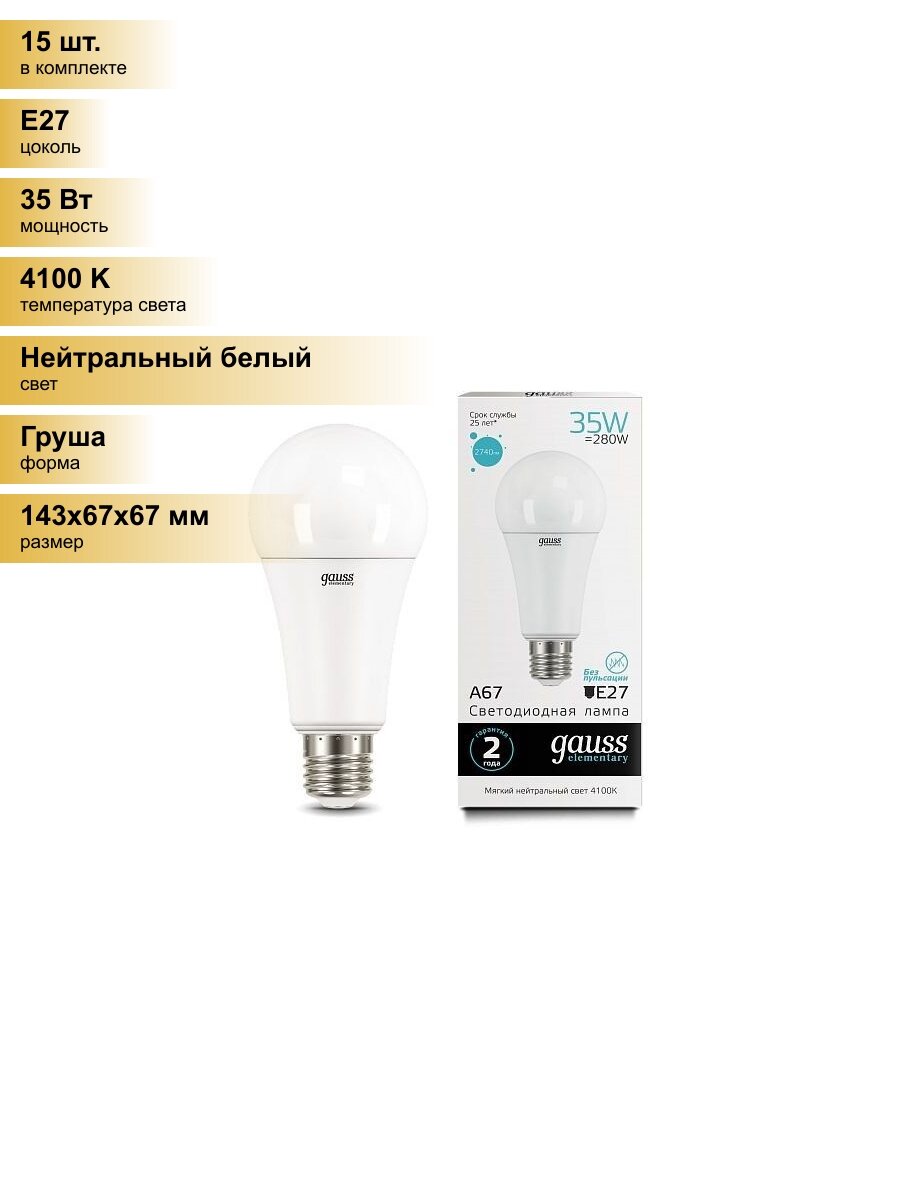 (15 шт.) Светодиодная лампочка Gauss Elementary ЛОН A67 E27 35W(2740lm) 4100K 4K 143x67 матовая, пластик/алюм. 70225 Нейтральный белый. Цоколь E27 информация: