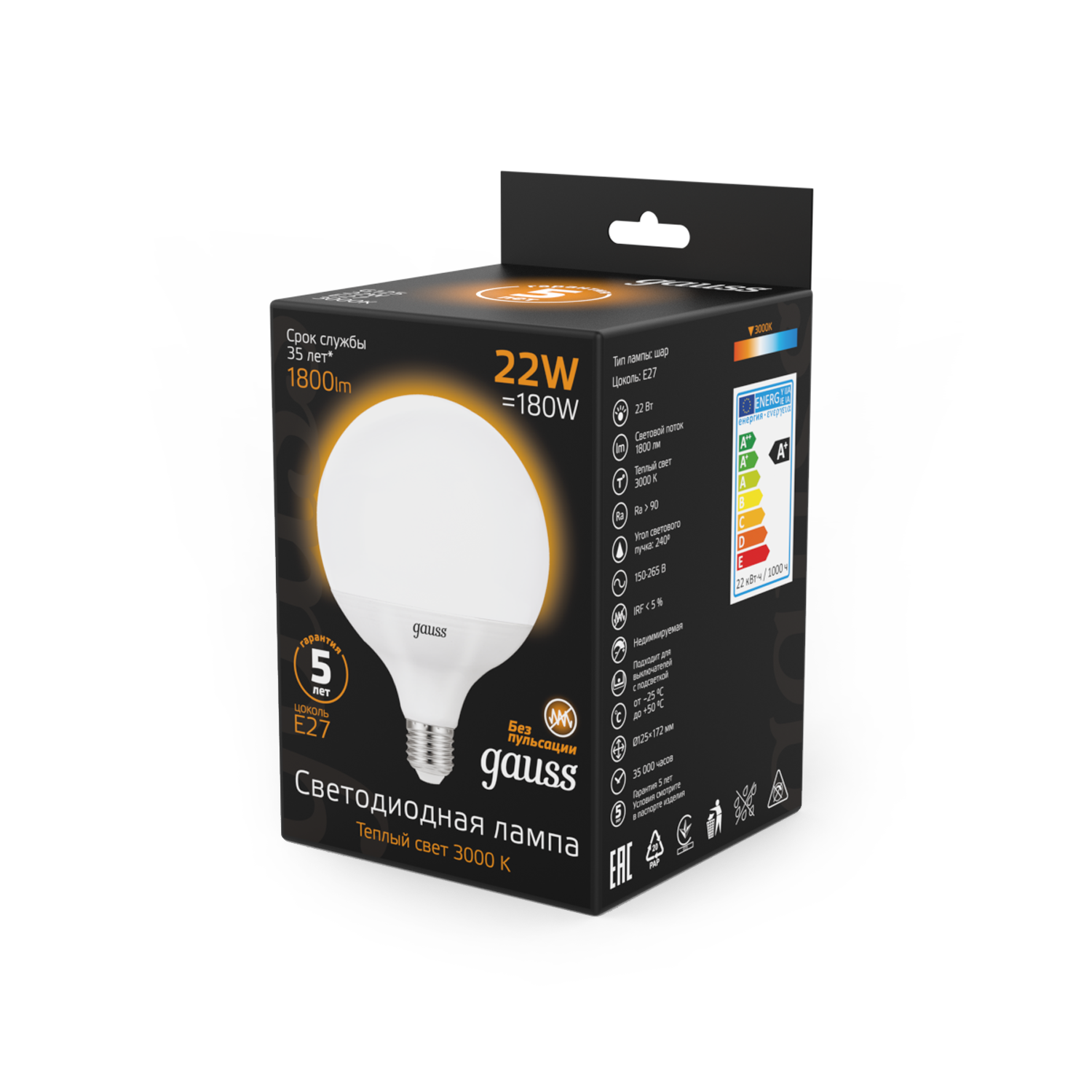 Лампа светодиодная Black 22Вт G125 шар 3000К тепл. бел. E27 1800лм GAUSS 105102122