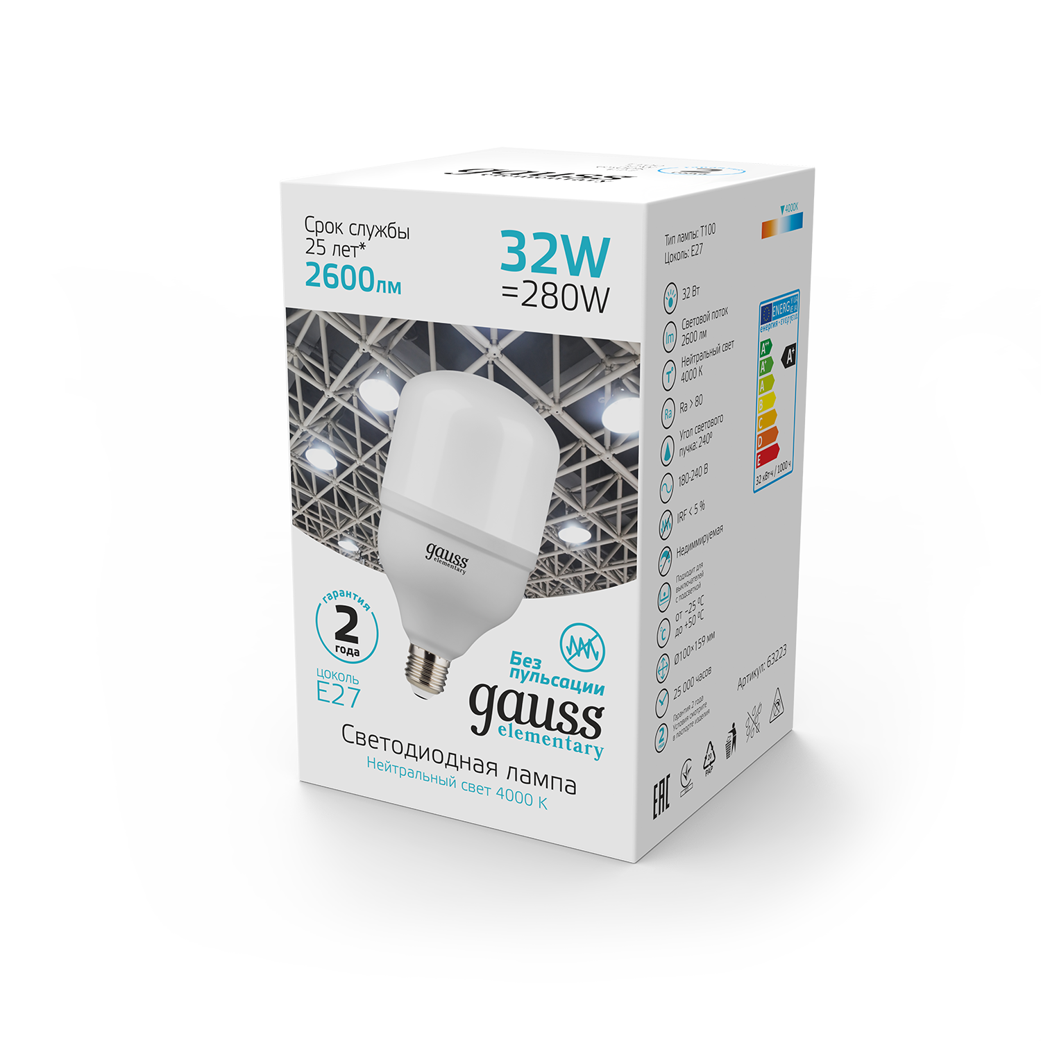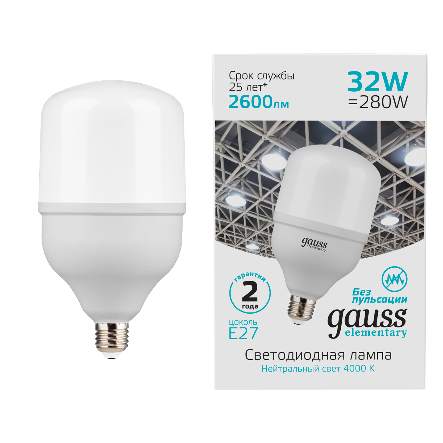 Лампа светодиодная LED 32 Вт 2700 Лм 6500К E27 цилиндр Т100 холодная Elementary, GAUSS 63233 (1 шт.)