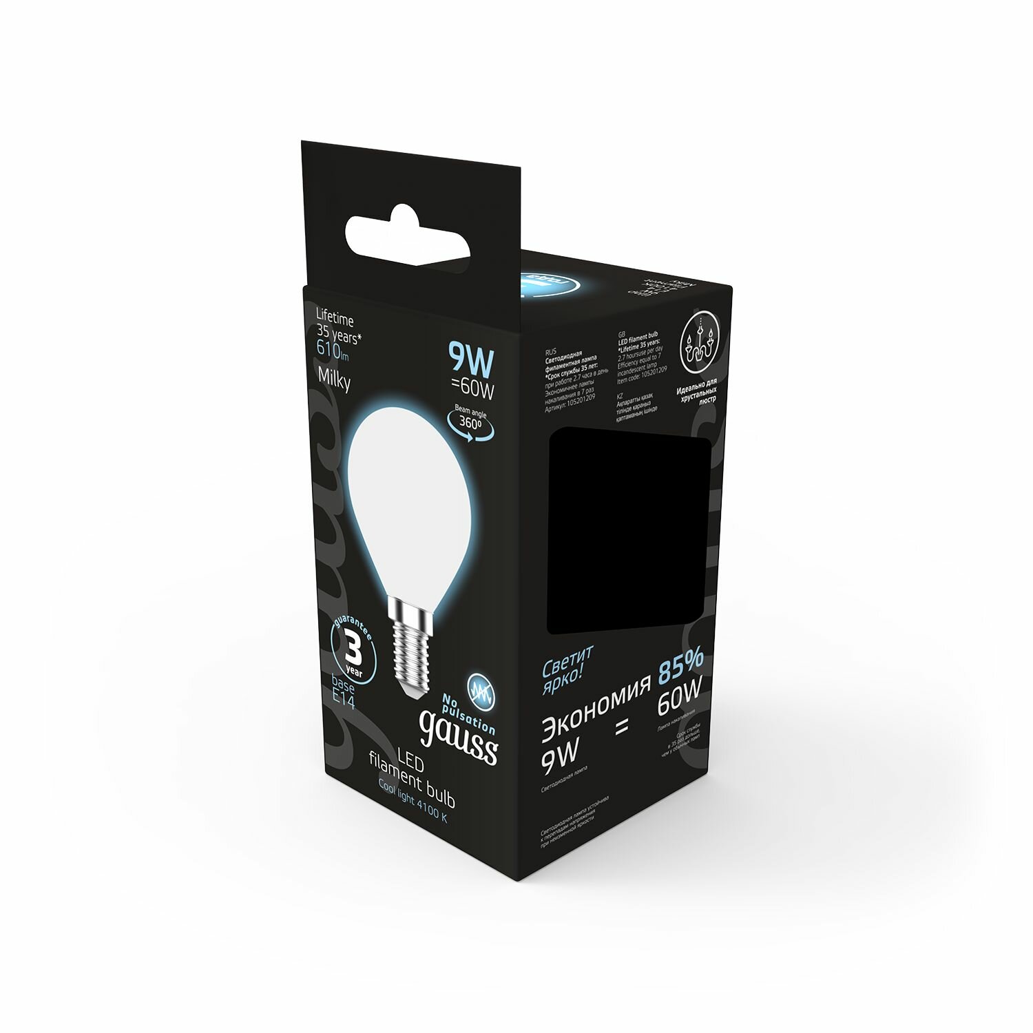 Отзывы на Лампочка светодиодная E14 Шар 9W нейтральный белый свет 4100K упаковка 10 шт. Gauss Filament
