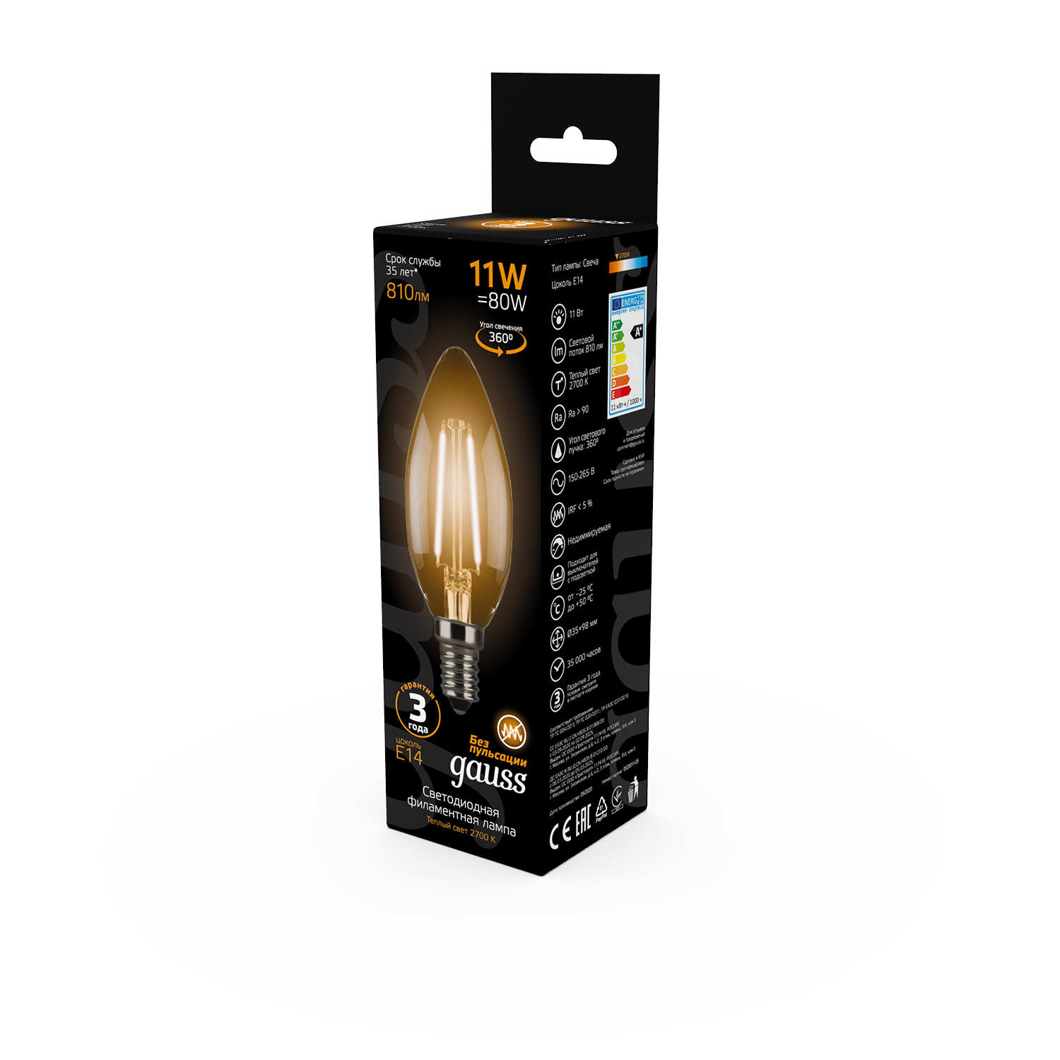 Отзывы на Лампочка светодиодная Е14 Свеча 11W теплый свет 2700К упаковка 10 шт. Gauss Filament