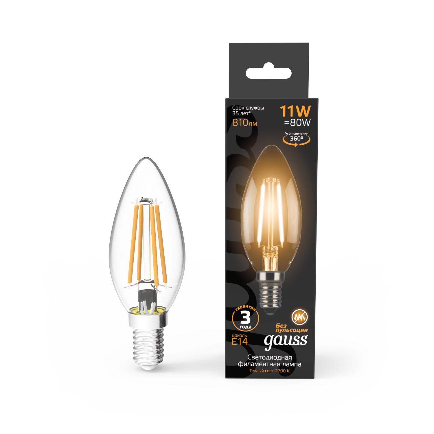 Лампочка светодиодная Е14 Свеча 11W теплый свет 2700К упаковка 10 шт. Gauss Filament информация: