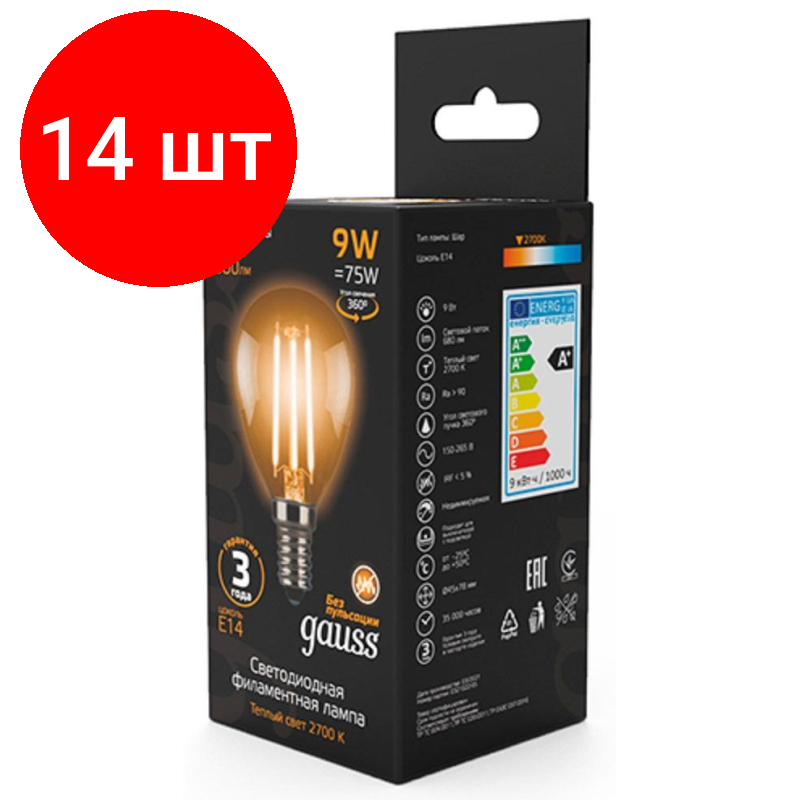 Отзывы на Комплект 14 штук, Лампа светодиодная Gauss LED Filament Шар E14 9Вт 680Лм 2700K (105801109)
