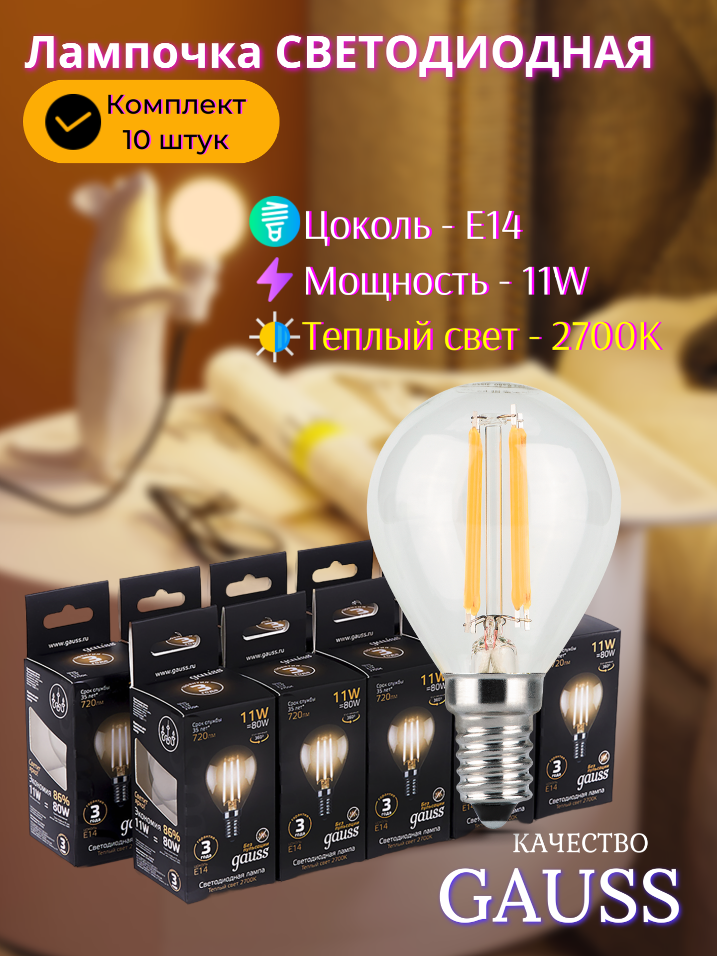 Отзывы на Лампочка светодиодная Е14 Шар 11W теплый свет 2700K упаковка 10 шт. Gauss Filament