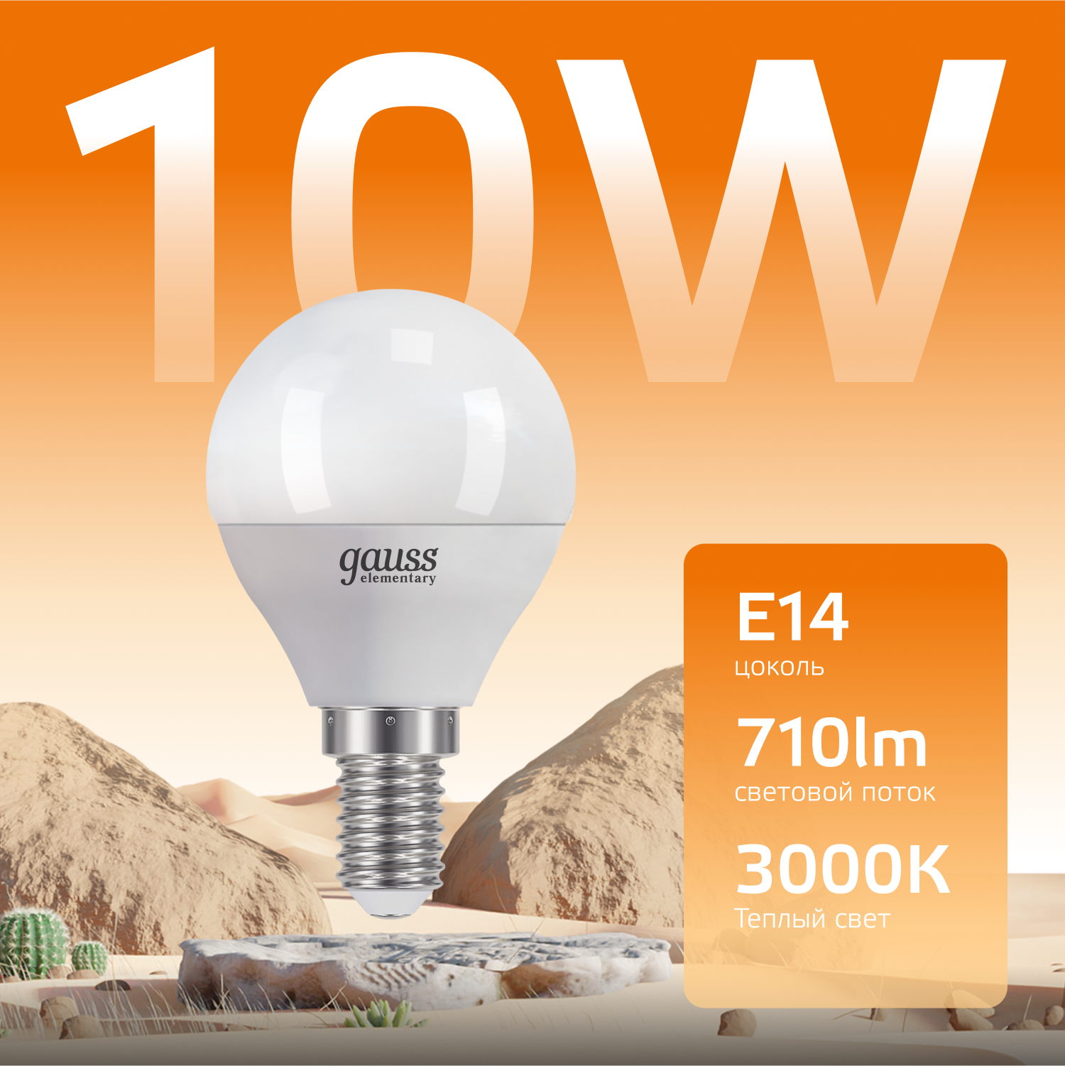 Лампочка светодиодная E14 Шар 10W теплый свет 3000K упаковка 10 штук Gauss Elementary информация: