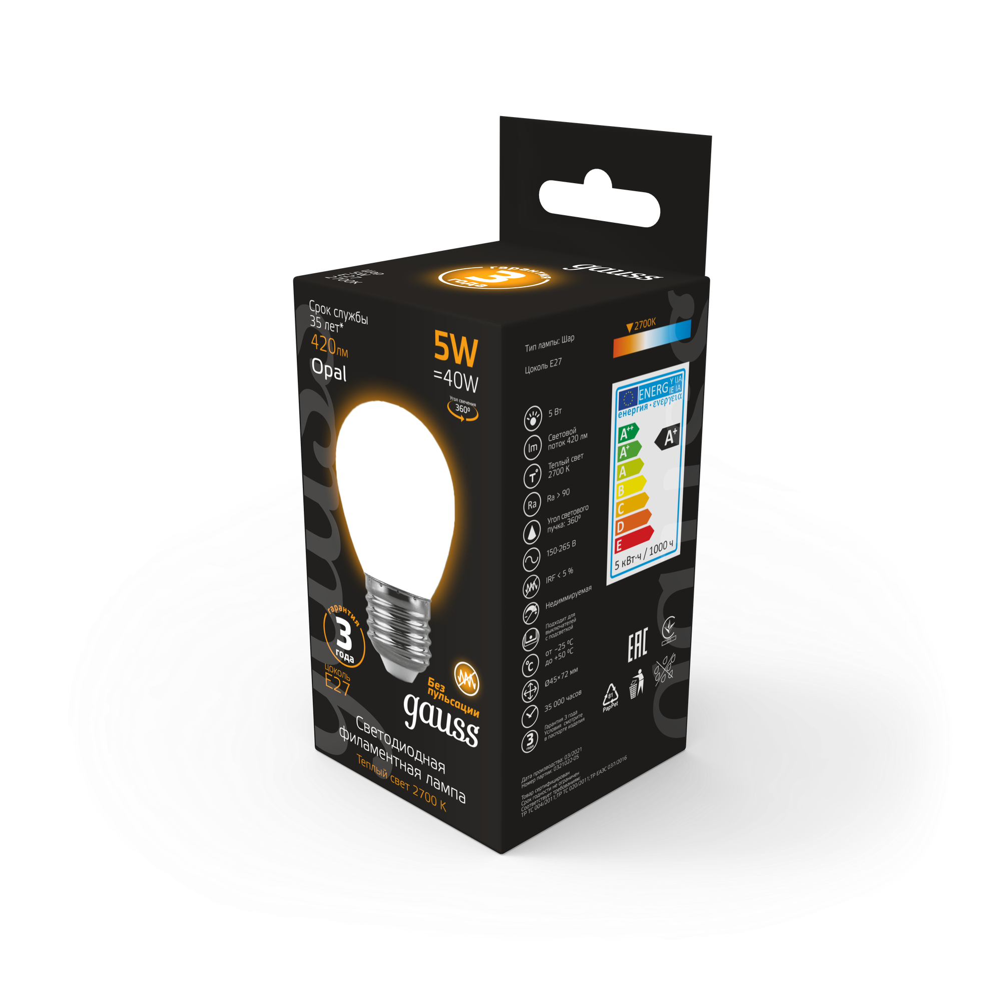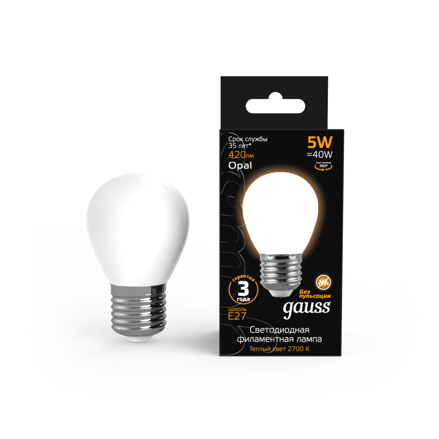 Лампочка светодиодная E27 Шар 5W теплый свет 2700K упаковка 10 штук Gauss Filament OPAL