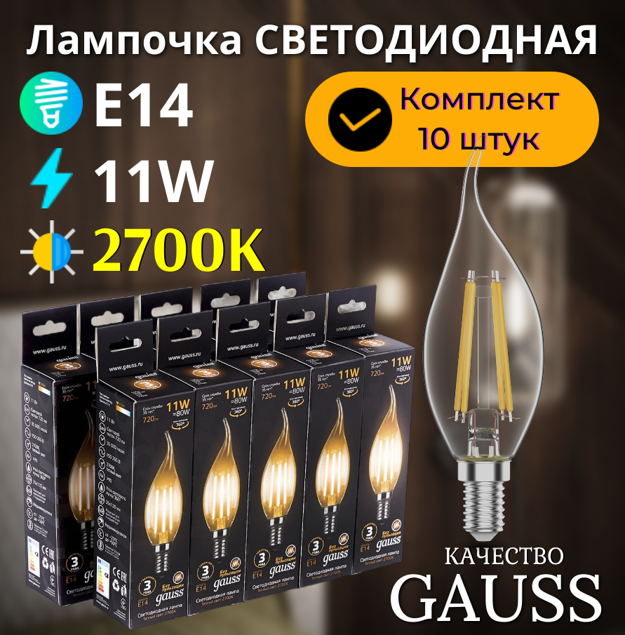 Отзывы на Лампочка светодиодная E14 Свеча на ветру 11W теплый свет 2700K упаковка 10 шт. Gauss Filament