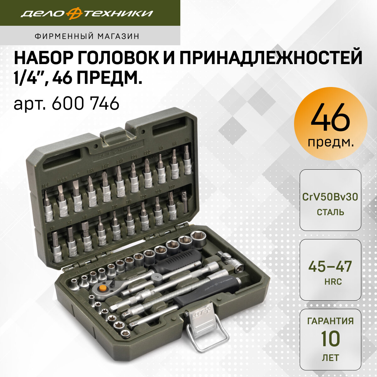 Набор головок (46 предметов) "Дело Техники" (1/4", 6 граней, с трещоткой) дело техники 600746 | цена за 1 шт | минимальный заказ 1