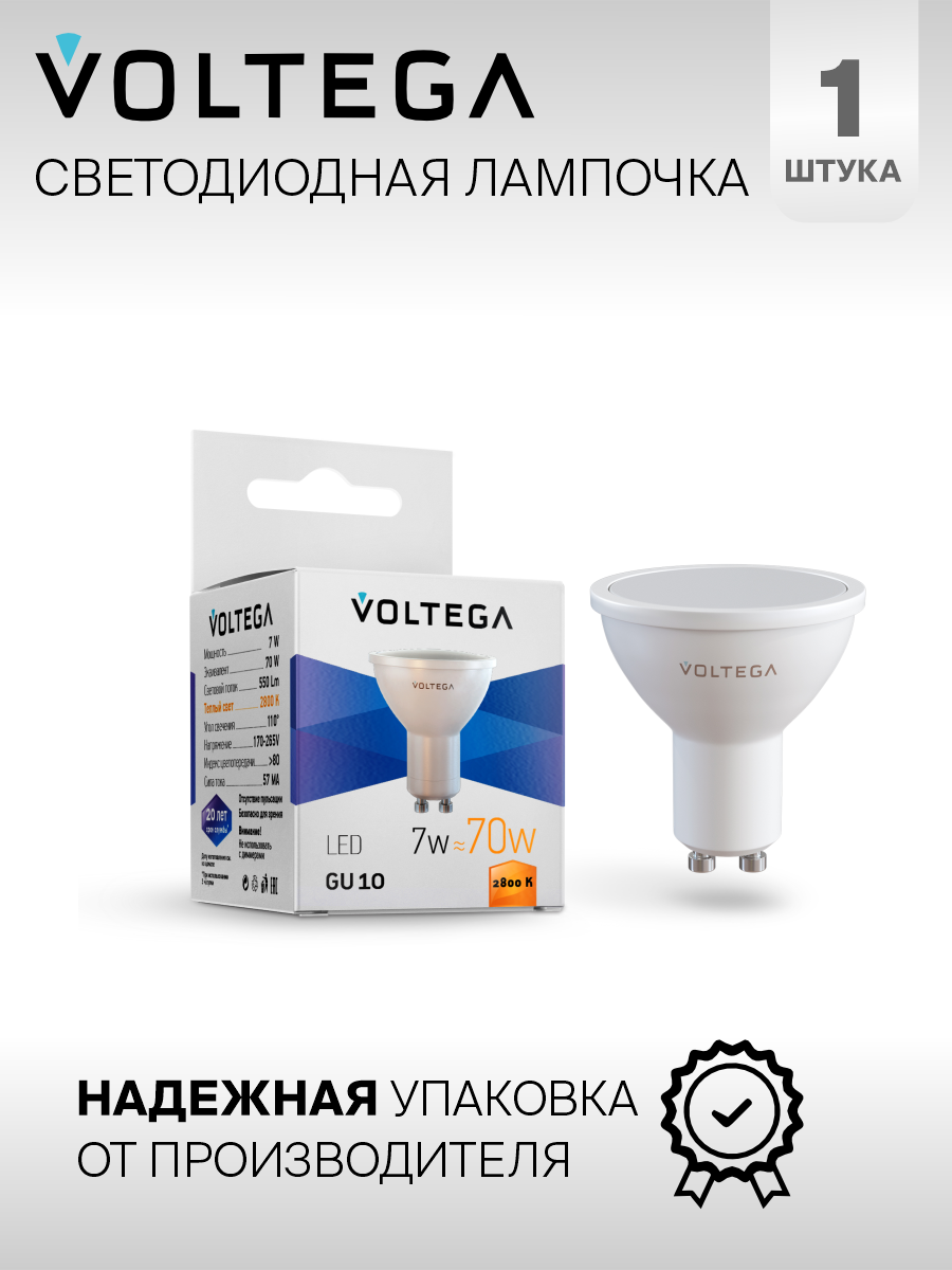 10 цен на Светодиодная лампа Voltega 7056 LED GU10 7W 2800К (теплый белый). Форма колбы лампочки - софит