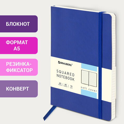 Блокнот А5 (148x218 мм), BRAUBERG "Metropolis Ultra", под кожу, 80 л., резинка, клетка, синий, 111017 (цена за 1 ед.товара)