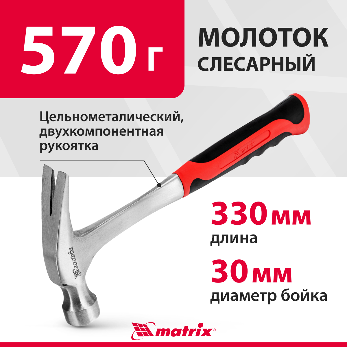 Молоток-гвоздодер, 570 г, цельнометаллический, двухкомпонентная рукоятка// MATRIX