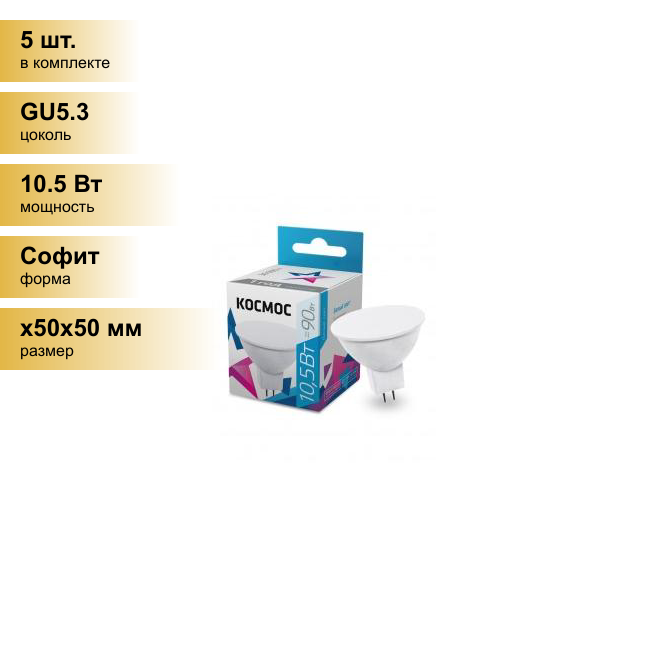 (5 шт.) Светодиодная лампочка Космос MR16 GU5.3 220V 10,5W (10W) (860lm) 4500K 4K матов. 45x50 LkecLED10.5wJCDRC45 . Цоколь GU5.3 информация: