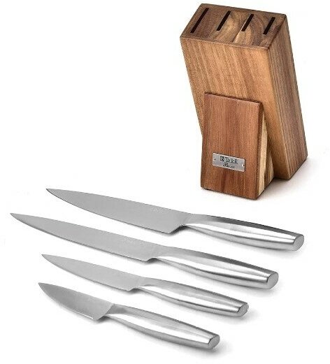 | Комплектация | нож поварской (лезвие 20 см х 2,5 мм), нож для нарезки (лезвие 20 см х 2,5 мм), нож для хлеба (лезвие 20 см х 2,5 мм), нож универсальный (лезвие 12,5 см х 2 мм), нож для чистки (лезвие 9 см х 2 мм), подставка |