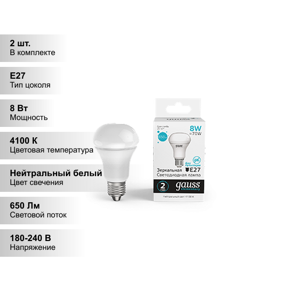 (2 шт.) Светодиодная лампочка Gauss Elementary R63 8Вт 650lm 4100K Е27 информация: