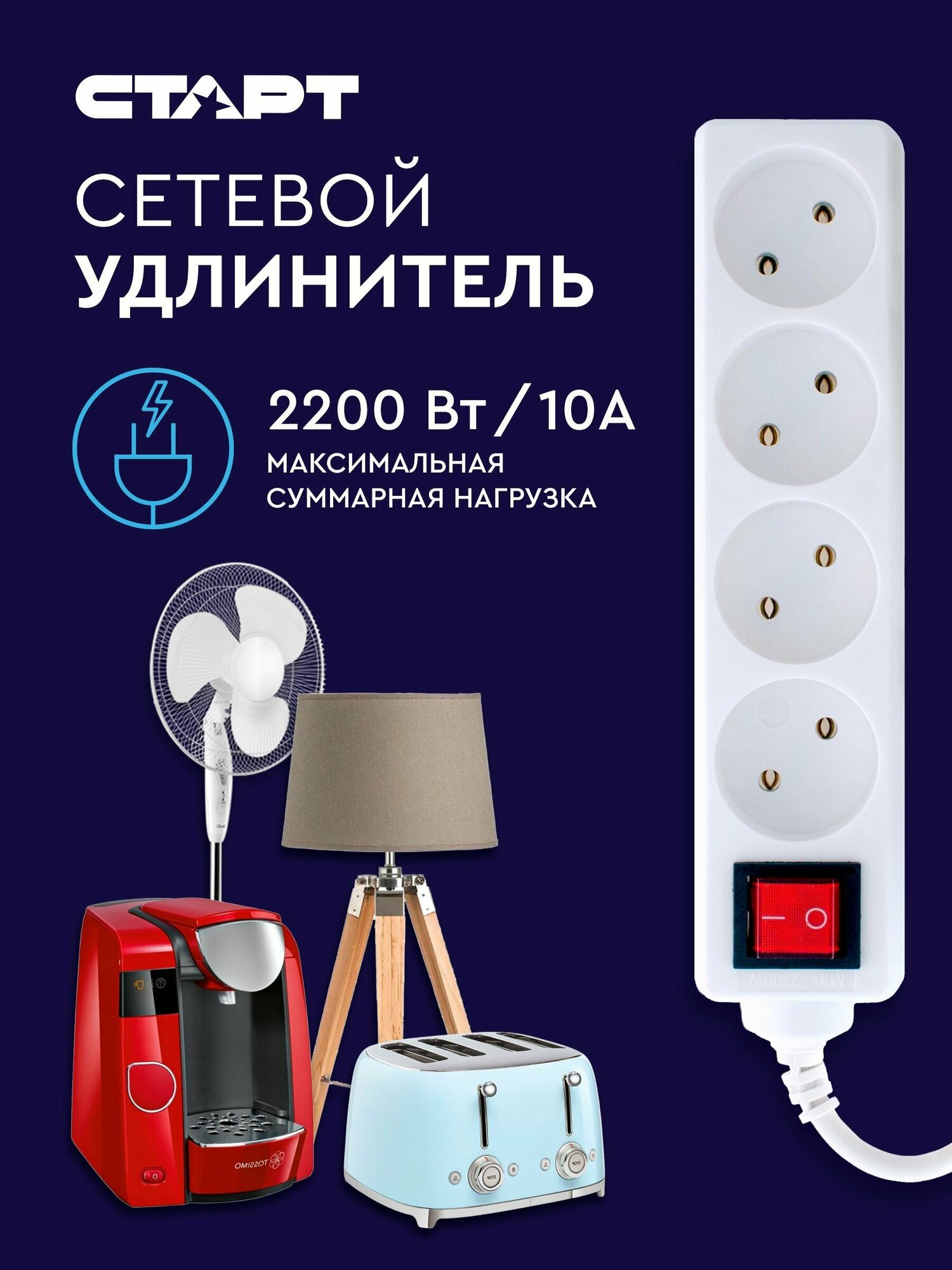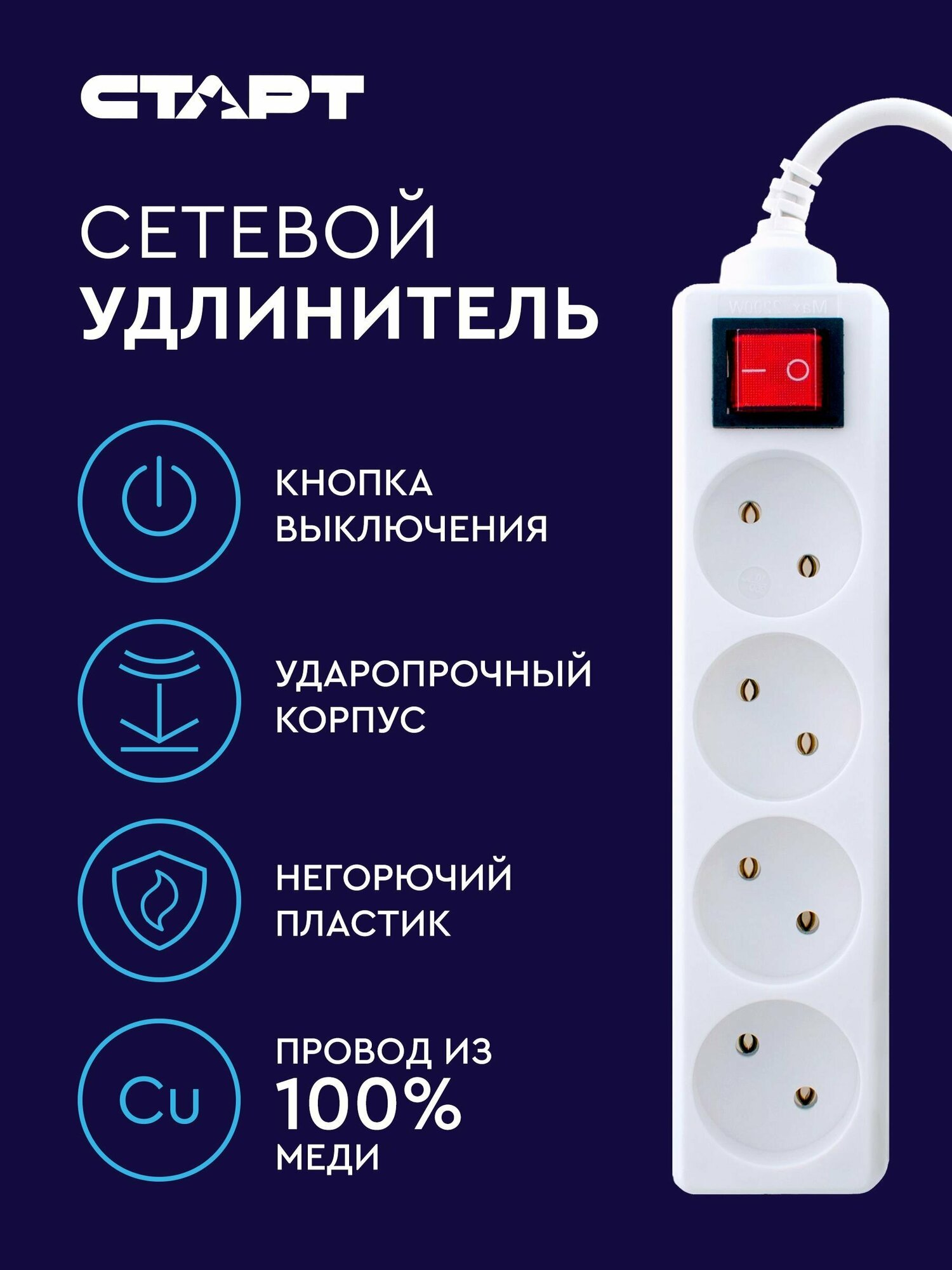 Удлинитель сетевой бытовой c заземлением 5м старт 4 розетки, 10А, 2200Вт информация: