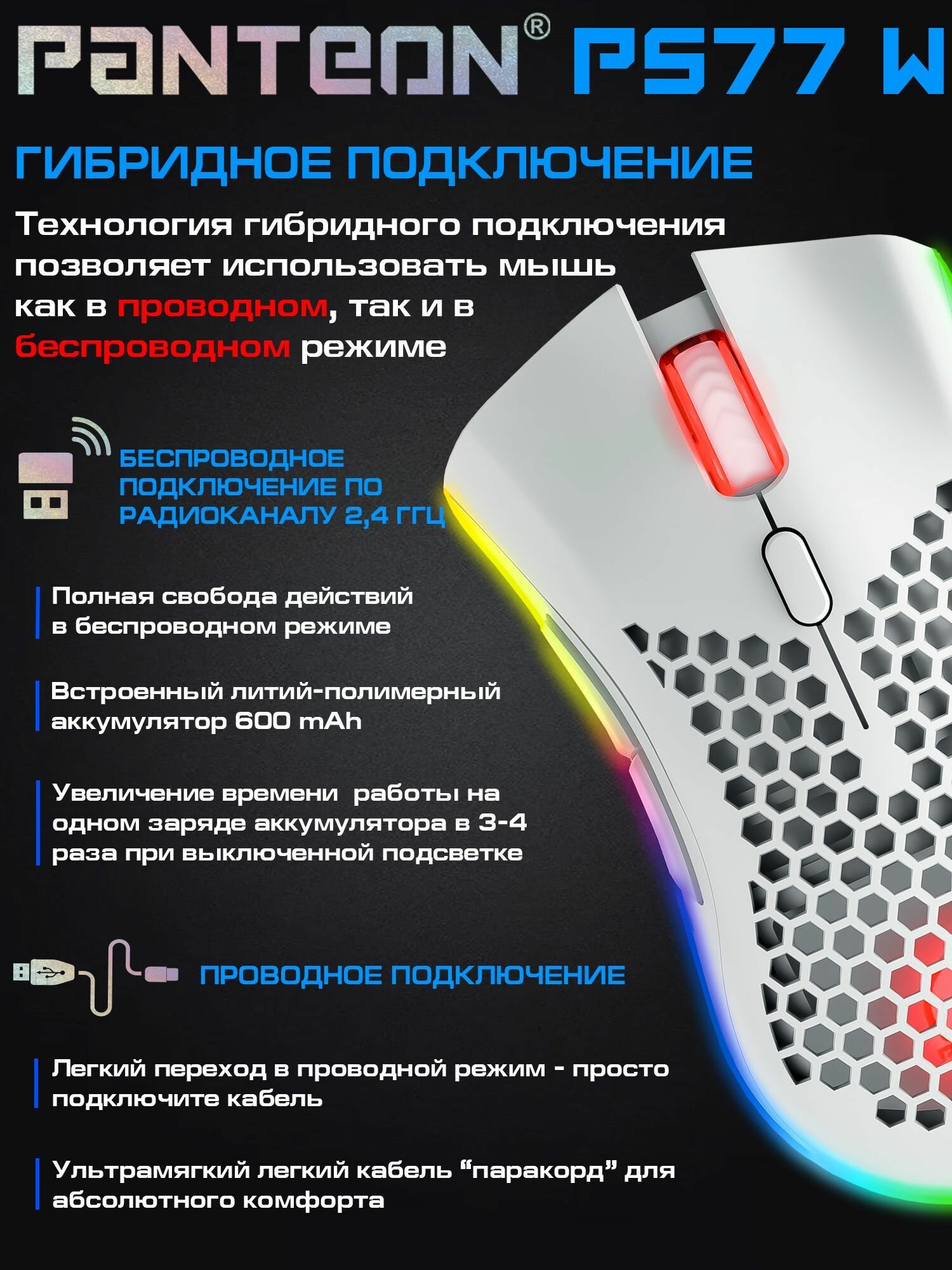 Гибридная игровая мышь беспроводная и проводная мышь с LED-подсветкой RGB CHROMA light PANTEON PS77 W белая информация: