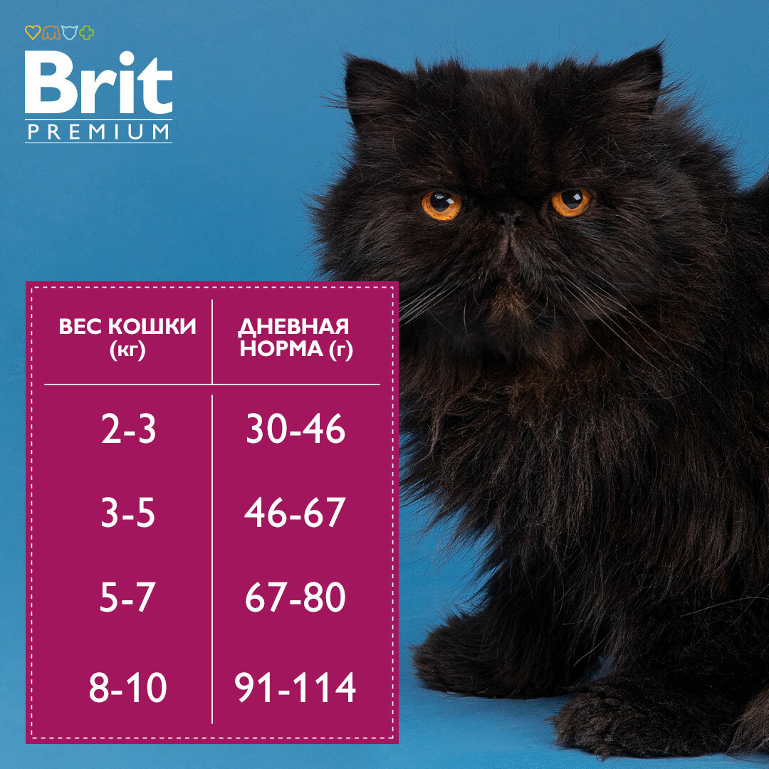 | Дозировка | вес кошки 2-3кг - 30-46 г/день вес кошки 3-5 кг -46-67 г/день вес кошки 5-7 кг - 67-80 г/день вес кошки 8-10 кг - 91-114 г/день |