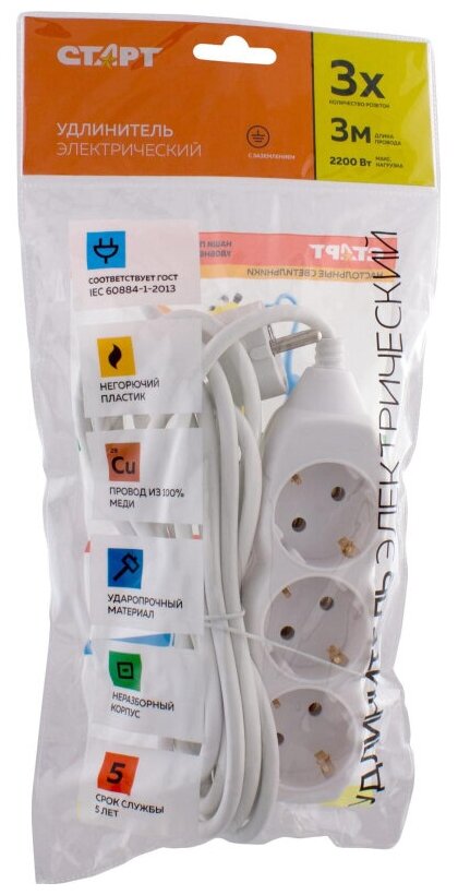Комплект 5 штук, Удлинитель старт (С/У S 3x3-Z) 3 розетки/3м/2200Вт/10А информация: