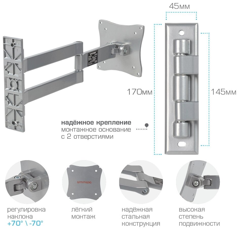Кронштейны для техники ARM MEDIA Кронштейн настенный ARM MEDIA LCD-7101 10-26" (наклон +70°/-70°, поворот 180°, до 15 кг, серебро)