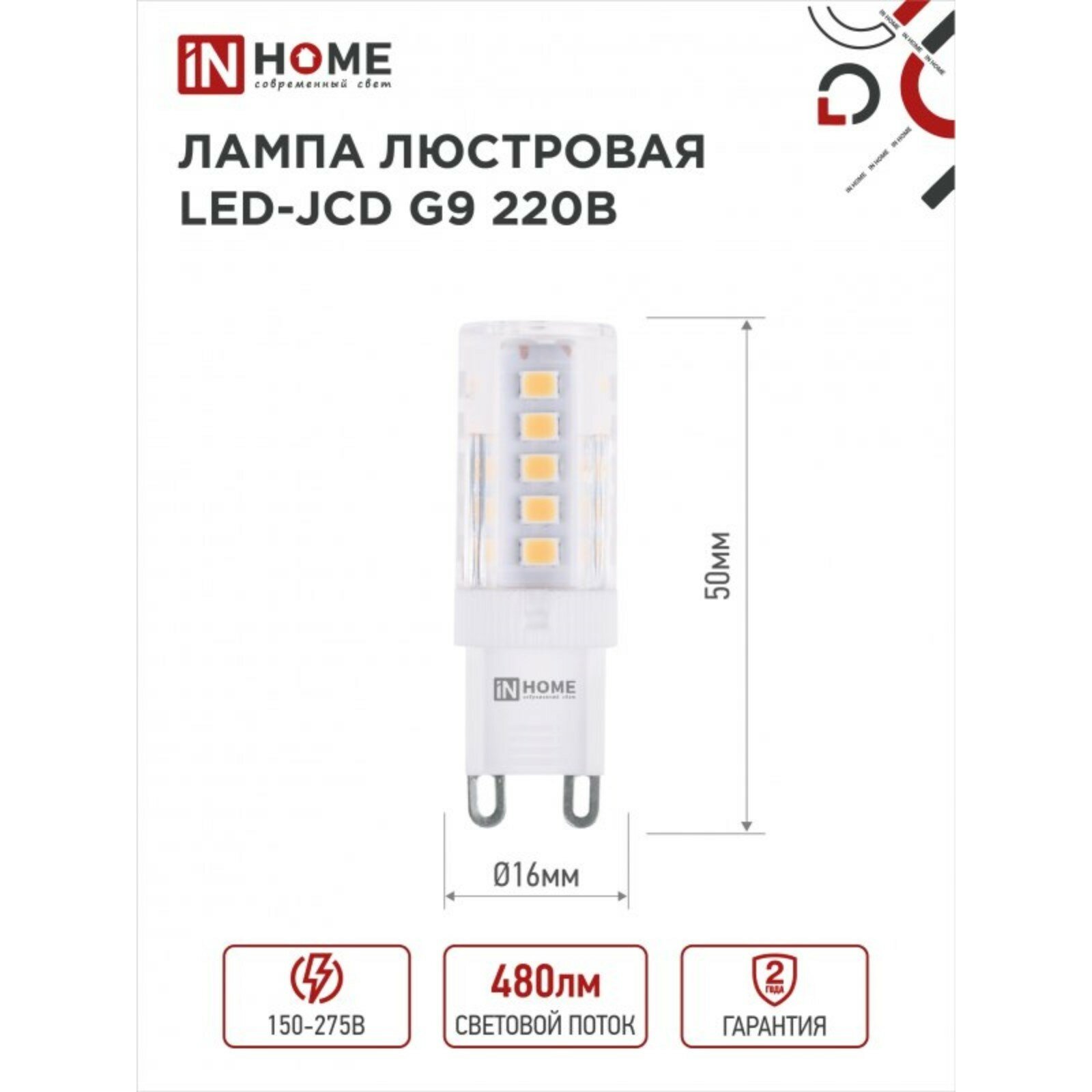 Лампа светодиодная IN HOME LED-JCD, 5 Вт, 230 В, G9, 4000 К, 480 Лм