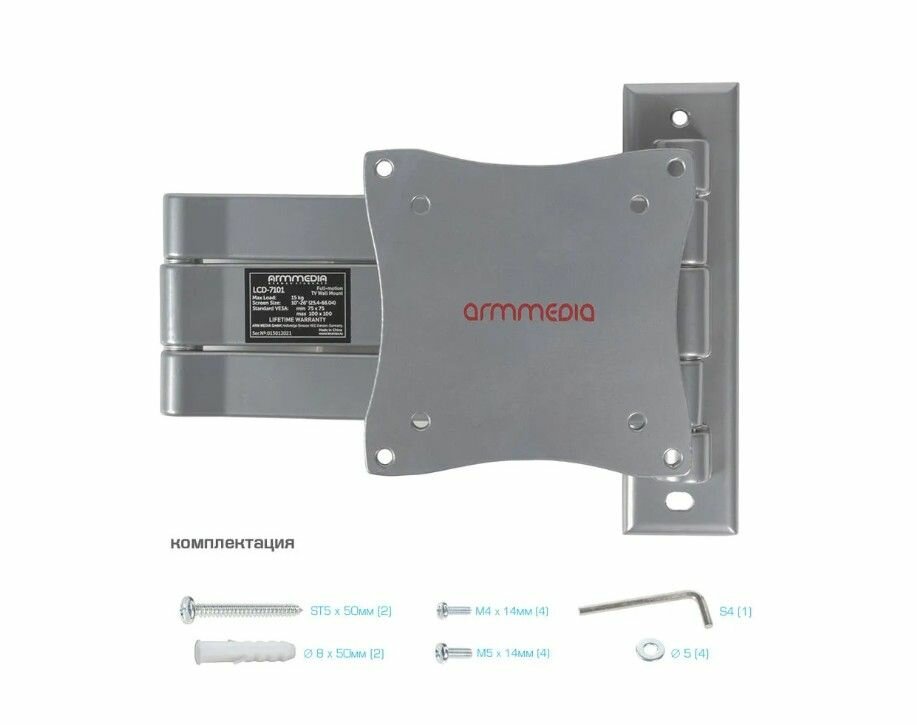 Кронштейн ARM Media LCD-7101 для LCD/LED 15-26 VESA 75-100 мм 4 ст.свободы max 15 кг настенный серебристый 1 764 ₽