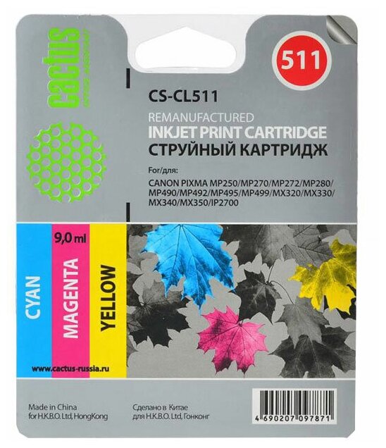 Cactus Расходные материалы CL-511 Картридж CS-CL511 для Canon PIXMA MP240 MP250 MP260 MP270 MP480 MP490 MP492 MX320 MX330, трехцветный, 9 мл