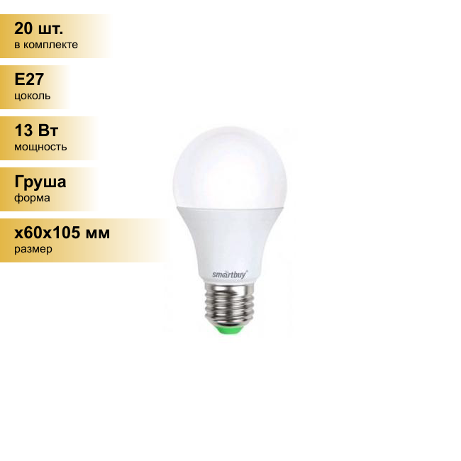10 цен на (20 шт.) Светодиодная лампочка Smartbuy ЛОН A60 E27 13W(1040lm) 4000K 4K 119x60 SBL-A60-13-40K-E27-A . Цоколь E27