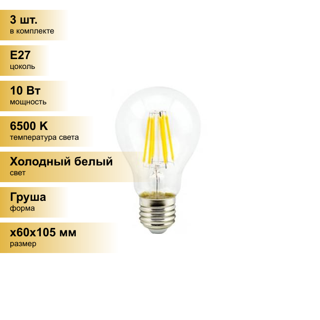 (3 шт.) Светодиодная лампочка Ecola ЛОН A60 E27 10W 6500K 6K прозр. 105x60 филамент (нитевидная) 360° Premium N7LD10ELC Холодный белый. Цоколь E27 информация: