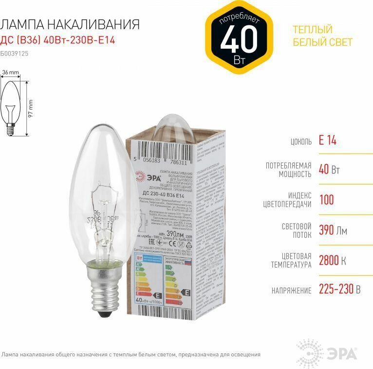 ЭРА Лампа накаливания ДС свечка 40Вт 230В Е14 в гофре, Б0039125 информация: