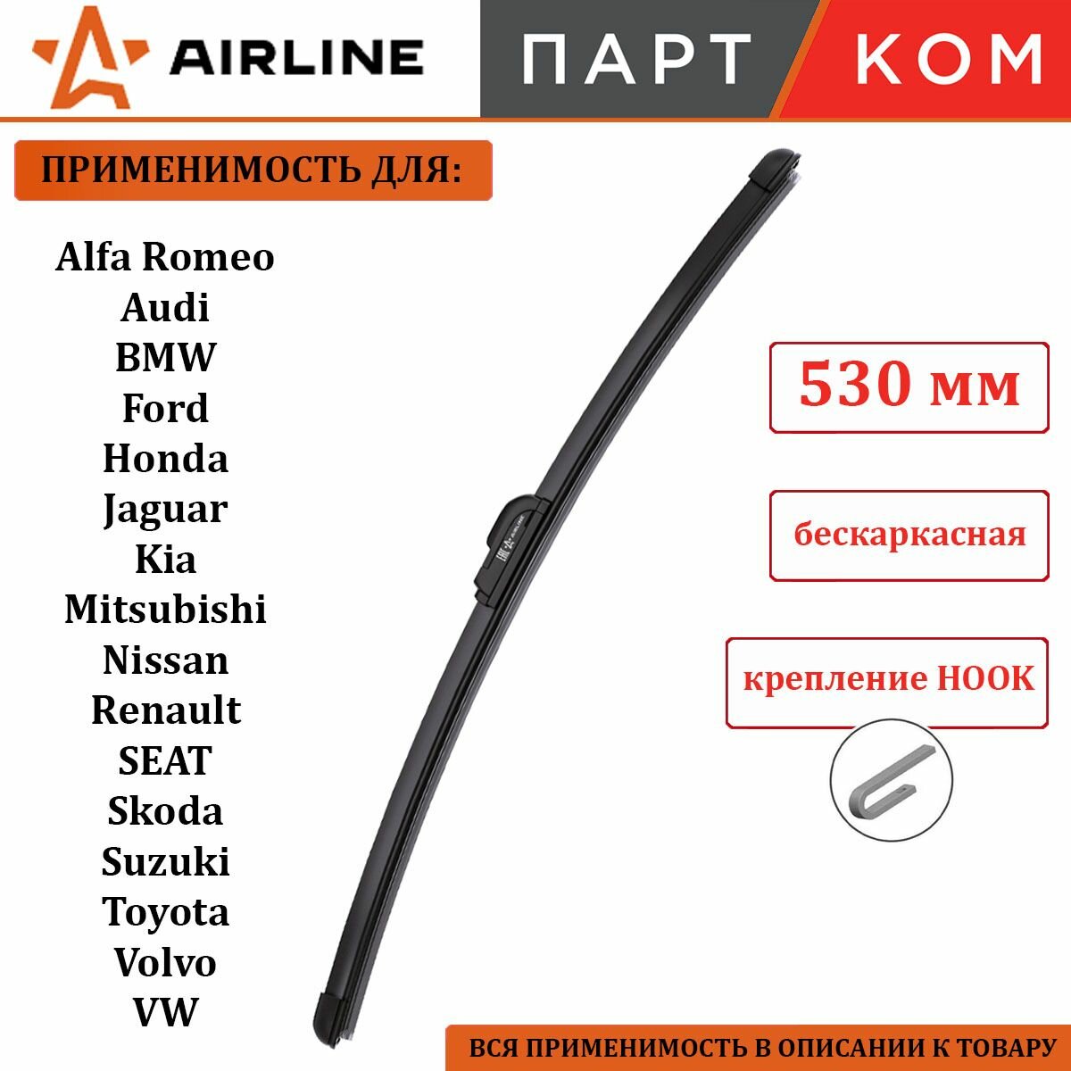 Щетка стеклоочистителя бескаркасная 530 мм AIRLINE AWBBKP530 для а/м Audi, BMW, Jaguar, Kia, Lancia, Mazda, Nissan, Toyota информация: