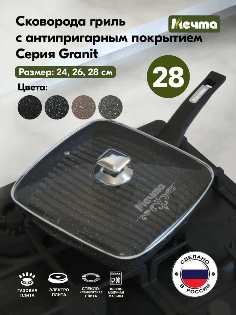 10 цен на Сковорода гриль Мечта квадратная 28х28 см Гранит с антипригарным покрытием с несъемной ручкой и крышкой, НЕ индукционная