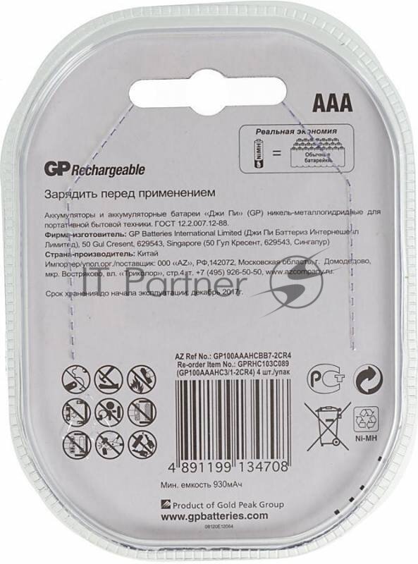 GP Перезаряжаемые аккумуляторы 100AAAHC AAA, емкость 1000 мАч - 4 шт GP 100AAAHC3/1-2CR4 информация: