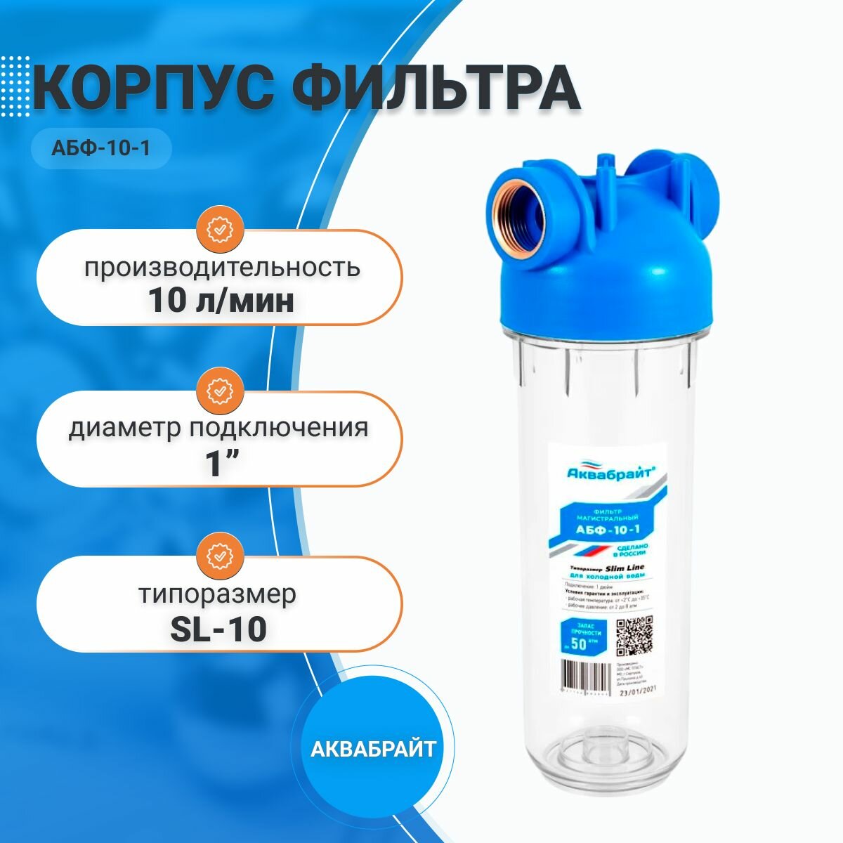 Корпус фильтра Аквабрайт АБФ-10-1 прозрачный, для холодной воды, SL10, 1 дюйм информация: