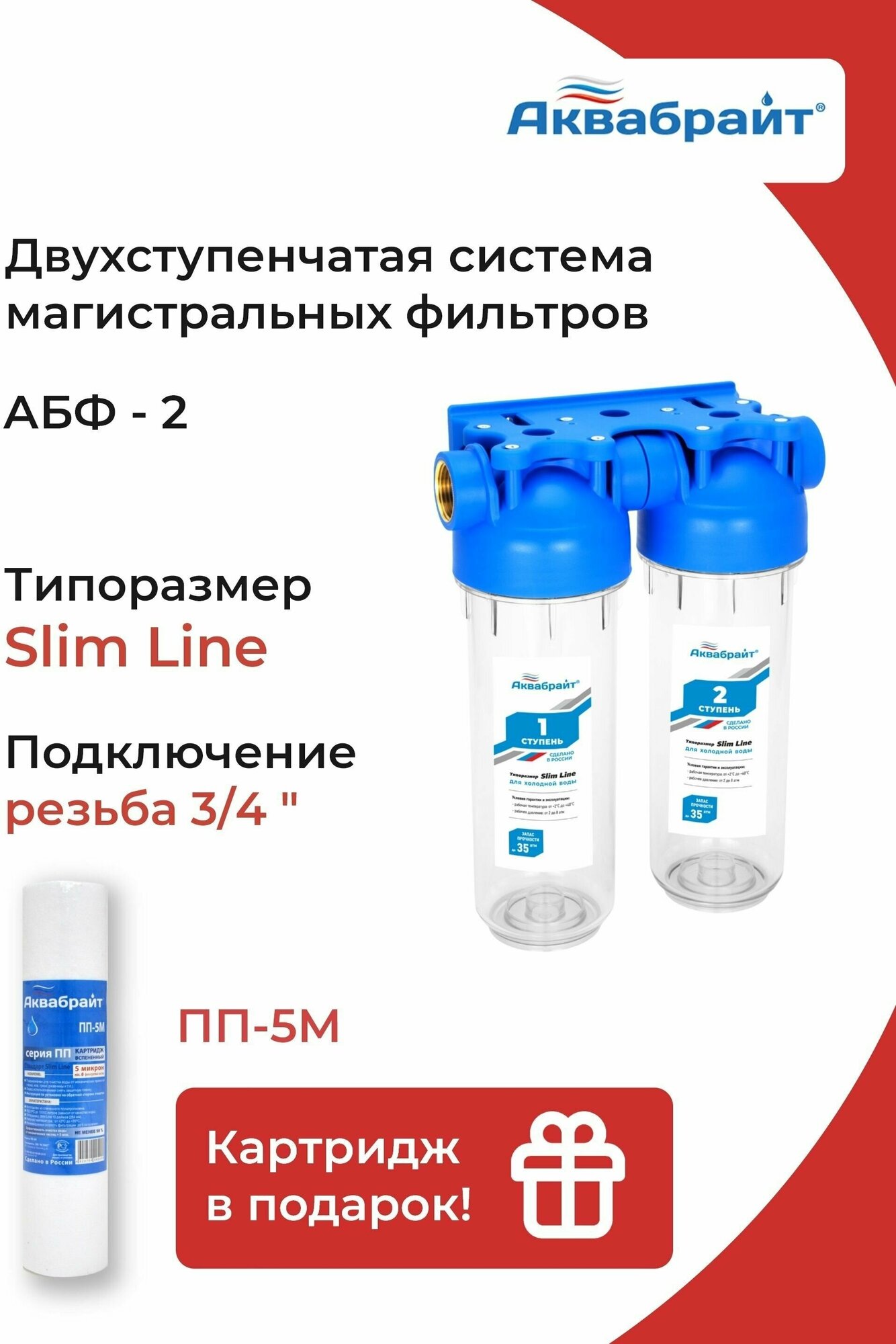 Фильтр магистральный Аквабрайт АБФ-2-12 (1/2) SLIM LINE стандарт двойной без картриджей, колба, ключ, кранштейн