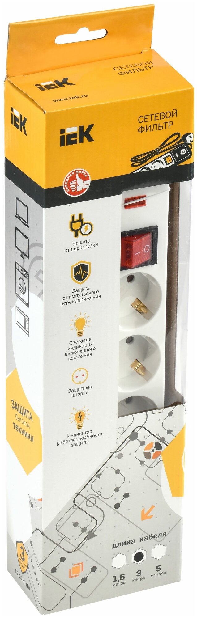Сетевой фильтр СФ-05К-выкл. 5 мест 2P+PE/3метра 3х1мм2 IEK