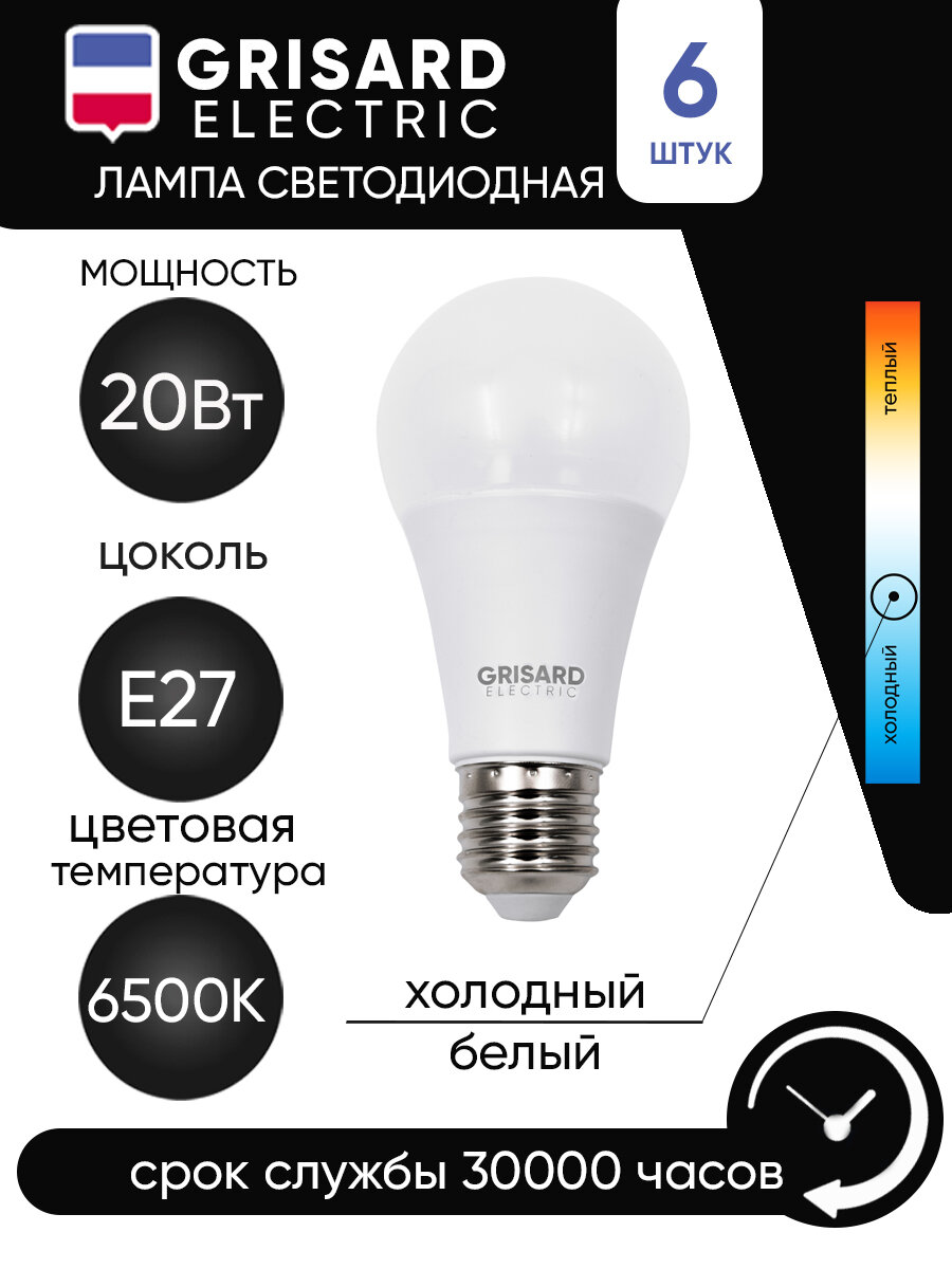 Лампа светодиодная GRISARD ELECTRIC шар A60 Е27 20 Вт 6500К220В 6 штук информация: