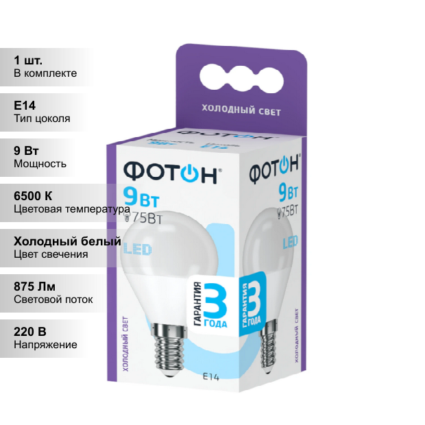 (1 шт.) Светодиодная лампочка Фотон P45 9Вт 220В 6500K E14 информация: