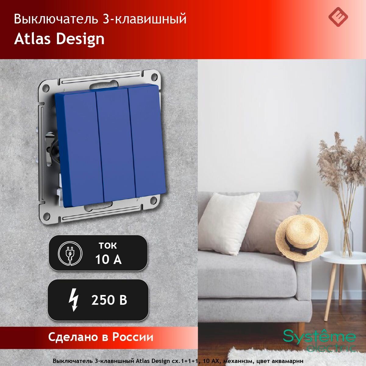 Systeme Electric AtlasDesign Аквамарин Выключатель 3-клавишный, сх.1+1+1, 10АХ, механизм