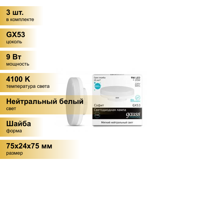 (3 шт.) Светодиодная лампочка Gauss Elementary GX53 9W(680lm) 4100K 4K 75x24 пластик/алюм.83829 Нейтральный белый. Цоколь GX53 информация: