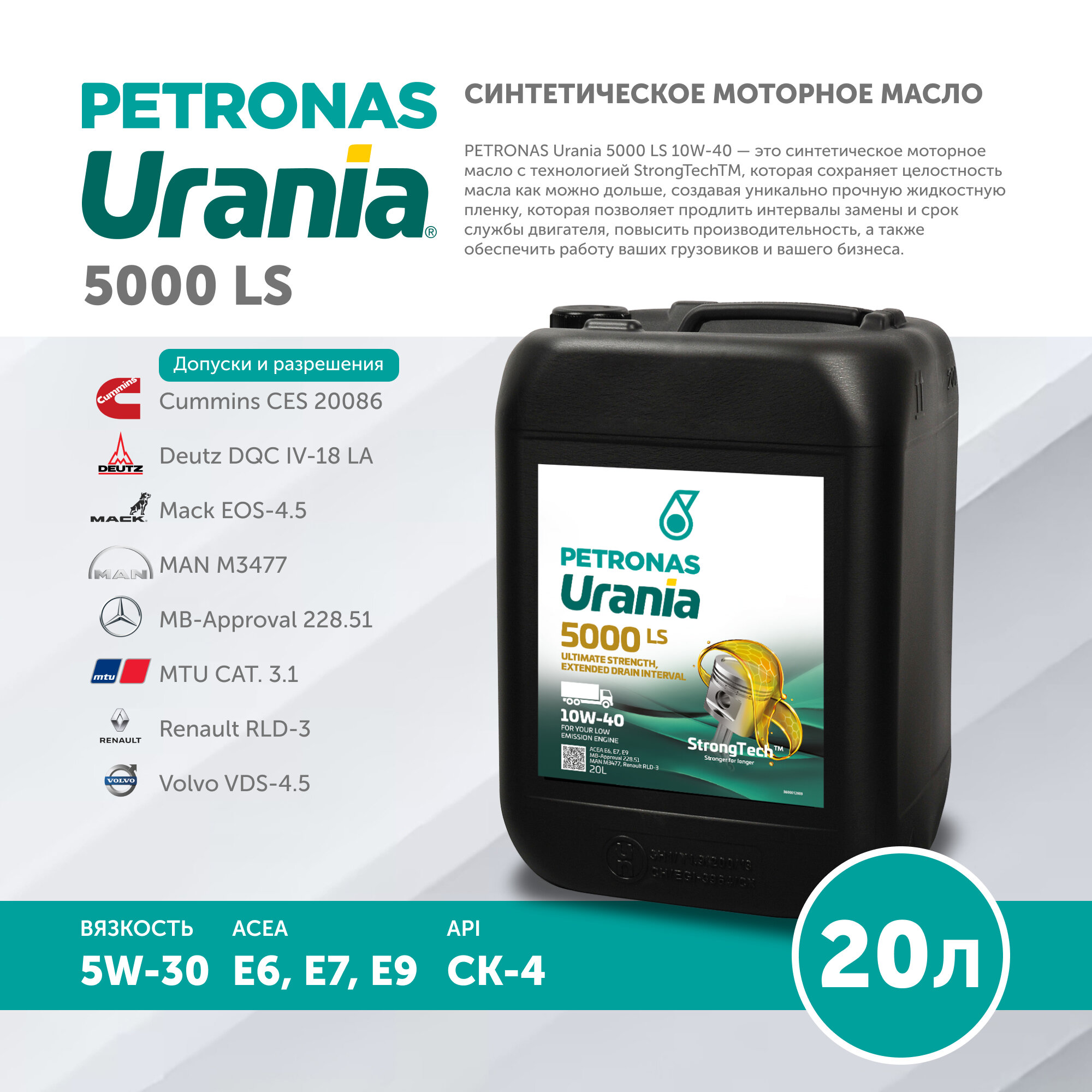 21 969 ₽ Моторное масло PETRONAS URANIA 5000 LS 10W40 20 литров 71710RK1EU Синтетическое MB 228.51 RLD3 VDS4.5 DAF Extended Drain, Scania Low Ash, 181804 EOS4.5