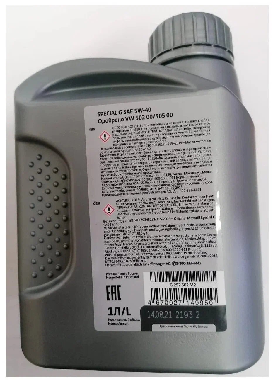 Синтетическое моторное масло VOLKSWAGEN Special G 5W-40 VW 502.00 505.00 505.01 1л VAG G052502M2 информация: