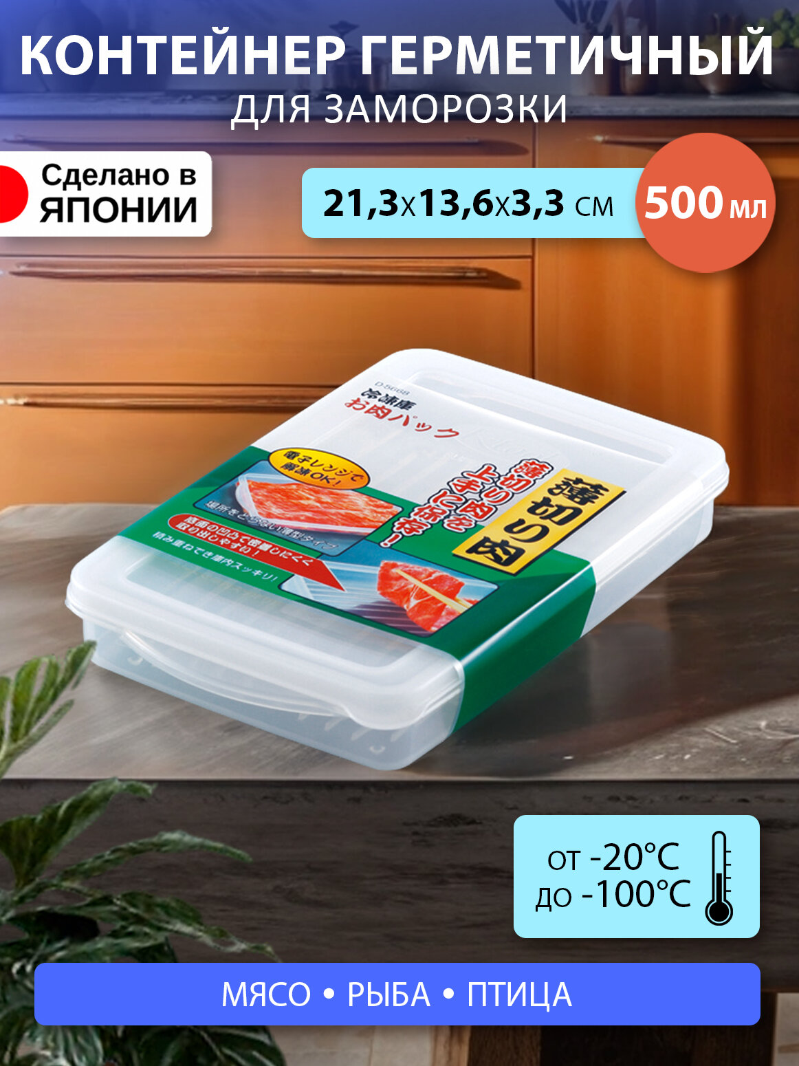 Контейнер для еды, СВЧ и заморозки пластиковый с крышкой 500 мл 21.3х13.6х3.3 см информация: