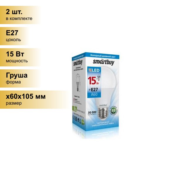 (2 шт.) Светодиодная лампочка Smartbuy ЛОН A60 E27 15W(1200lm) 6000K 6K 119x60 SBL-A60-15-60K-E27 . Цоколь E27 информация: