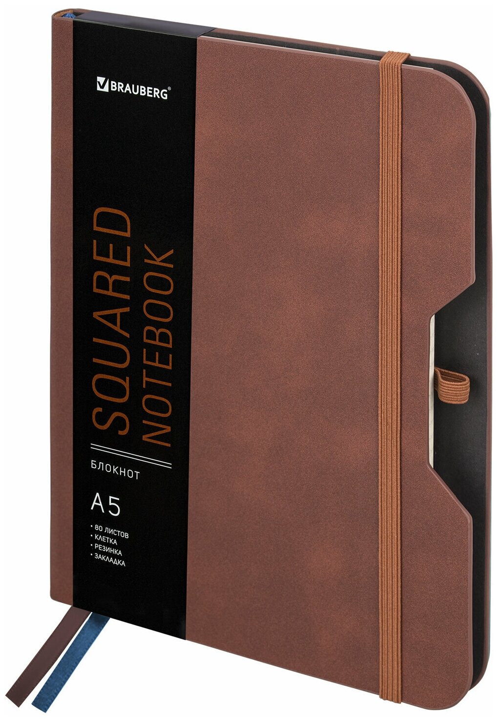 Бизнес-блокнот / записная книжка мужской / женский А5 (148х218 мм), Brauberg Note, под кожу софт-тач, с резинкой, 80 листов, клетка, коричневый информация: