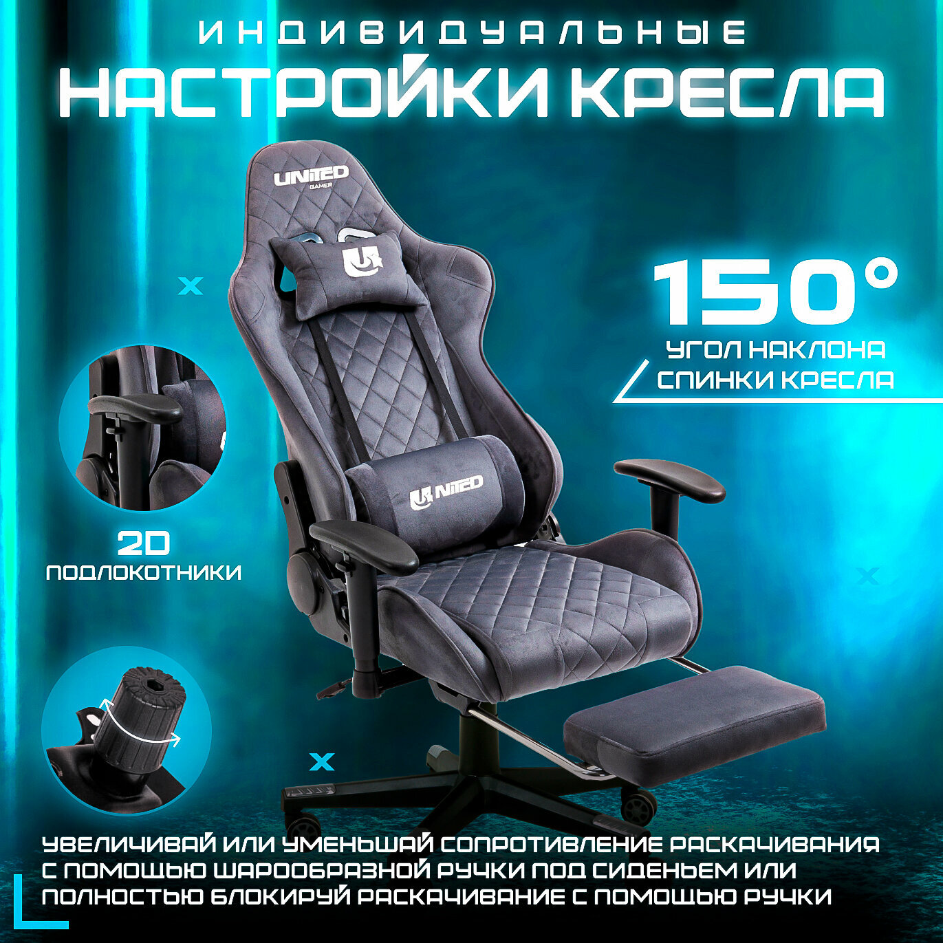 Кресло компьютерное UNITED GAMER WARRIOR, подставка для ног, серый велюр информация: