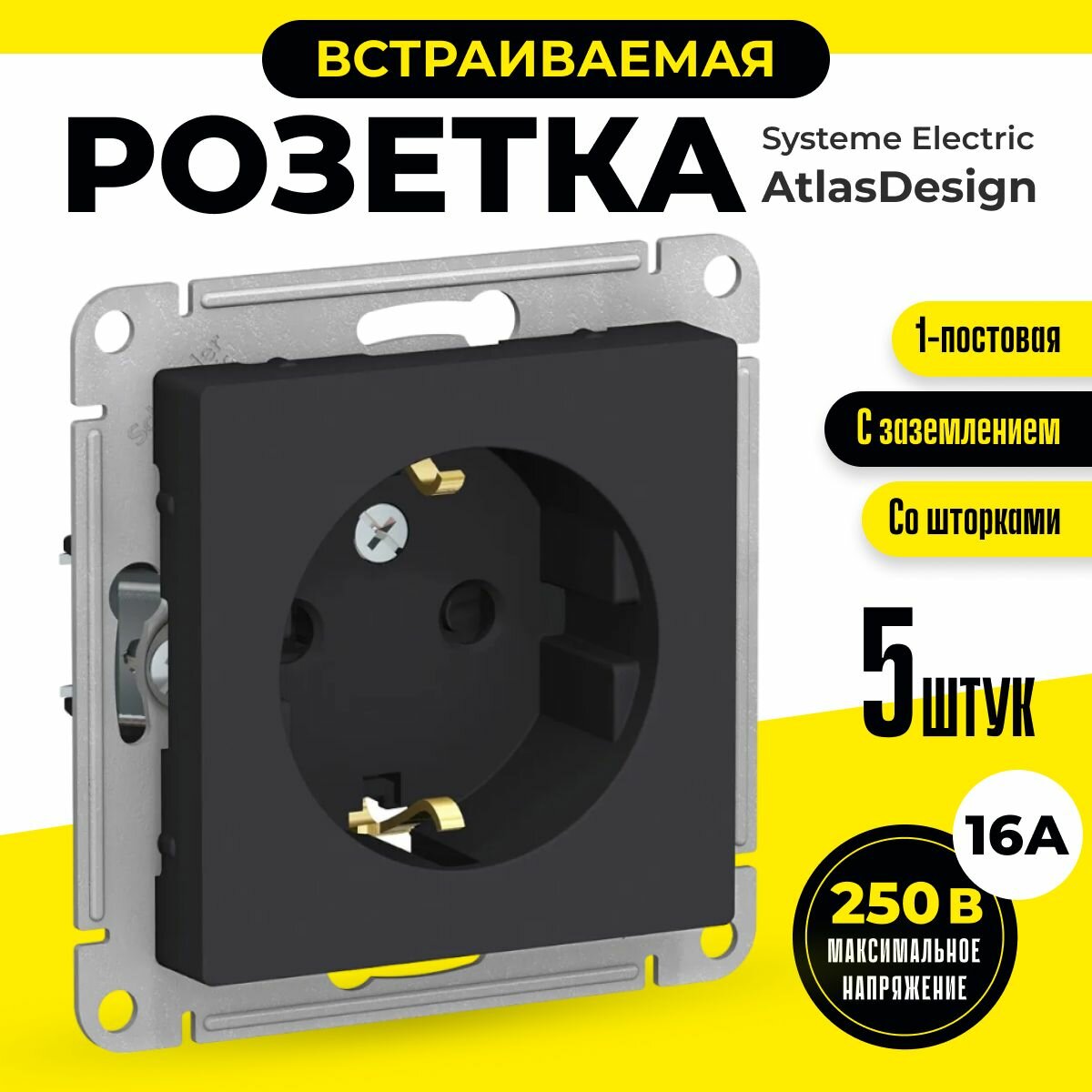 Розетка черная с заземлением карбон, Schneider/Systeme Electric ATLASDESIGN со шторками, 16А, механизм, ATN001045, 5шт 2 244 ₽